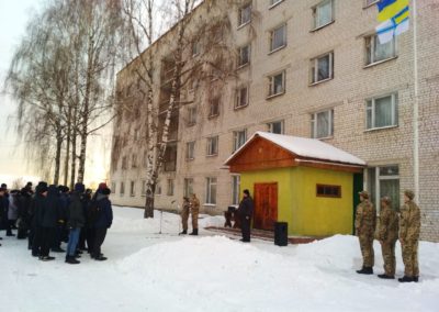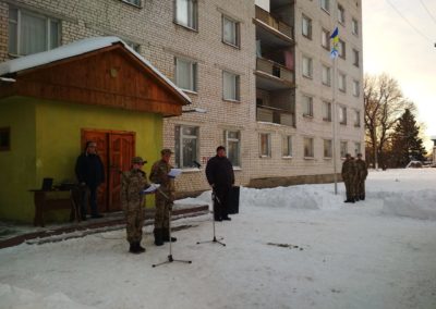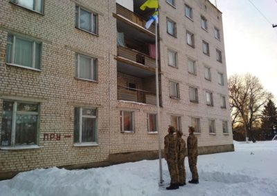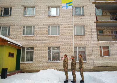 На флагштоку учні піднімають прапор Військово-морських сил України на знак підтримки полонених. які опинились у неволі після нападу росіян у Керченській протоці 25 листопада 2018 року.