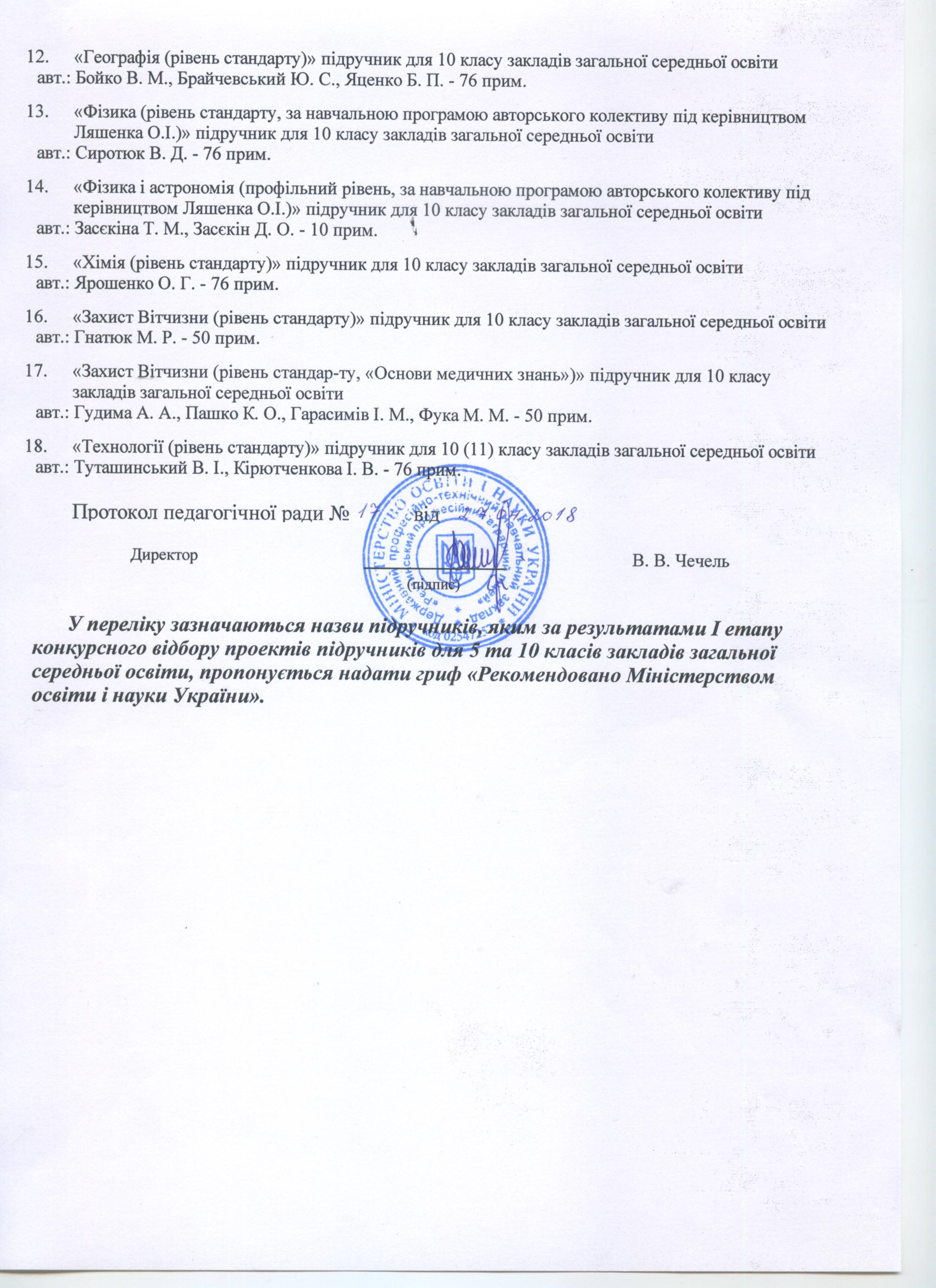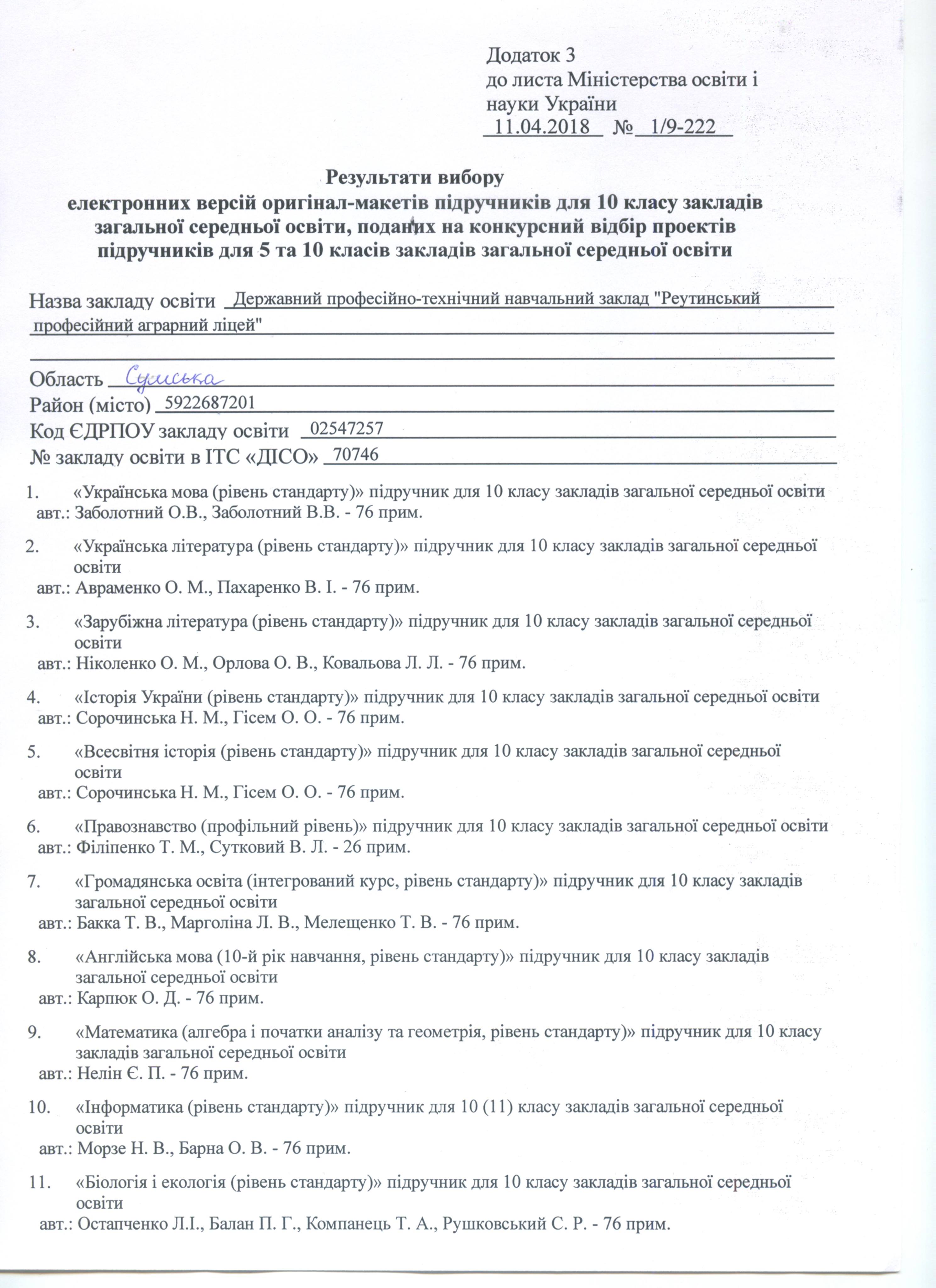 З 17 по 27 квітня 2018 року педагогічні працівники ліцею ознайомилися з фрагментами електронних версій оригінал-макетів підручників, що розміщенні за посиланням lib.imzo.gov.ua. Викладачі здійснили безпосередній вибір підручників, результати вибору схвалено на засіданні педагогічної ради.
