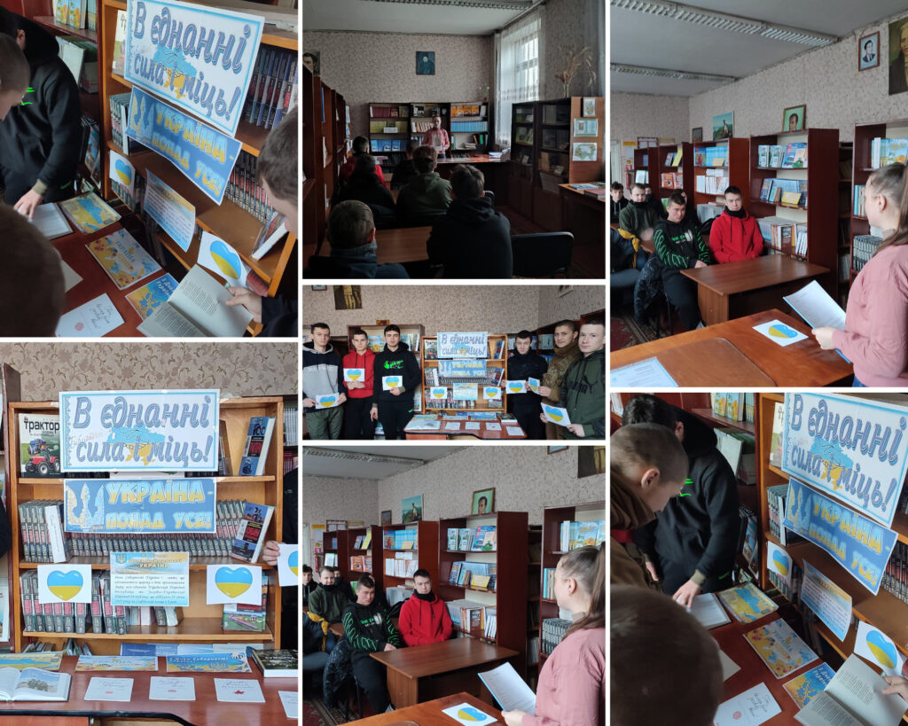 Бібліотекар Вікторія Слуцька провела виховну інформаційну годину а також була організована виставка присвячена цій визначній події «Єдина, Соборна, Незламна…».