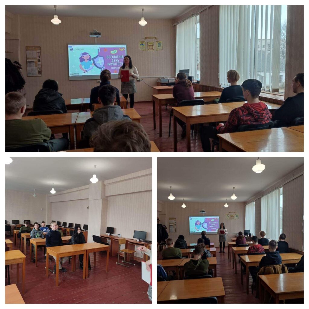 Сьогодні викладач біології Юлія ТВАРДОВСЬКА провела лекцію «Ваш імунітет-запорука здоров`я». Юлія Ігорівна розповіла здобувачам освіти про особливості функціонування імунної системи і способи її зміцнення (насамперед, зміна способу життя). Цей день обраний невипадково – на початку весни проблеми, пов’язані з ослабленням функцій імунної системи, виражені особливо яскраво. Адже наш організм виснажений боротьбою з зимовими вірусами та інфекціями, а також авітамінозом.Здобувачі освіти поділились своїми думками та досвідом зміцнення імунітету!