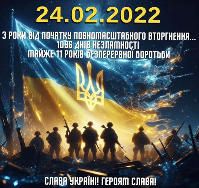 три роки від початку повномасштабного вторгнення російської федерації в Україну. Лют 24, 2025 | Новини Сьогодні ми згадуємо сумний день – три роки від початку повномасштабного вторгнення російської федерації в Україну. Це – 1096 днів стійкості, мужності та неймовірної єдності всього українського народу. Схиляємо голову перед тими, хто віддав своє життя, і дякуємо всім, хто бореться сьогодні за наше мирне завтра! https://reutpal.com.ua/wp-content/uploads/2025/02/video_2025-02-25_22-05-59.mp4