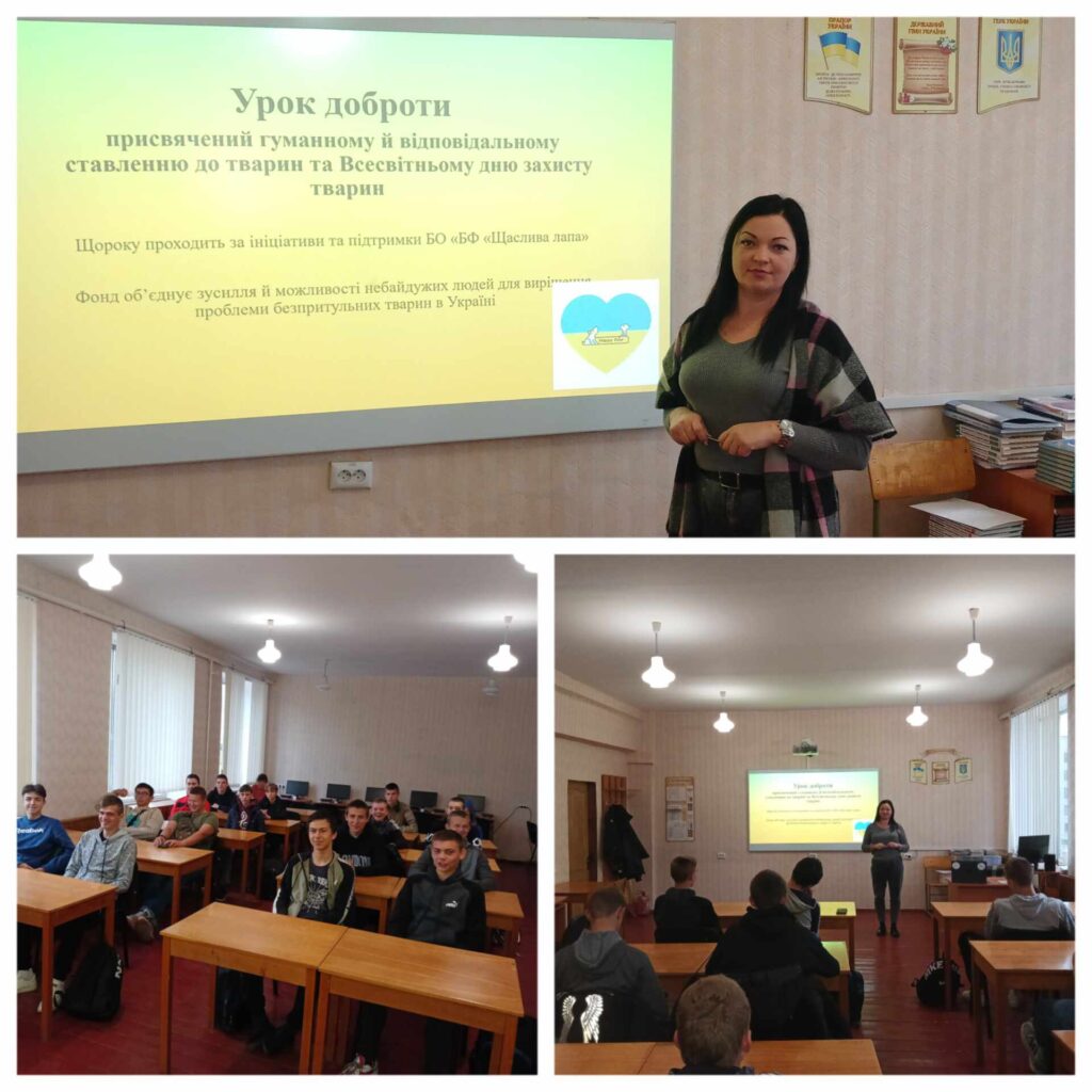 День захисту тварин 2023 в Україні особливий, адже тисячі тварин постраждали від війни, або втратили свій дім. Викладач біології і екології Юлія ТВАРДОВСЬКА провела “Урок доброти”. Здобувачі освіти переглянули відео “Тварини на війні: історії чотирилапих, які вразили світ своєю людяністю” та “Брати по війні: тварини на передовій”. Здобувачі освіти побачили приклад гідний для наслідування- відношення військових до тварин в умовах війни.