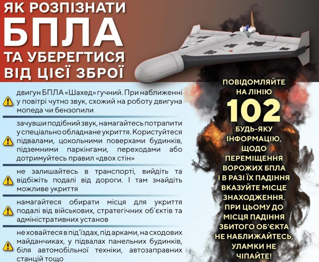 - Повідомляйте на лінію 102 будь-яку інформацію щодо БПЛА ворога, а в разі їх падіння – вказуйте місцерозташування.