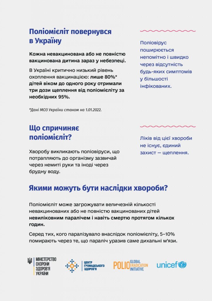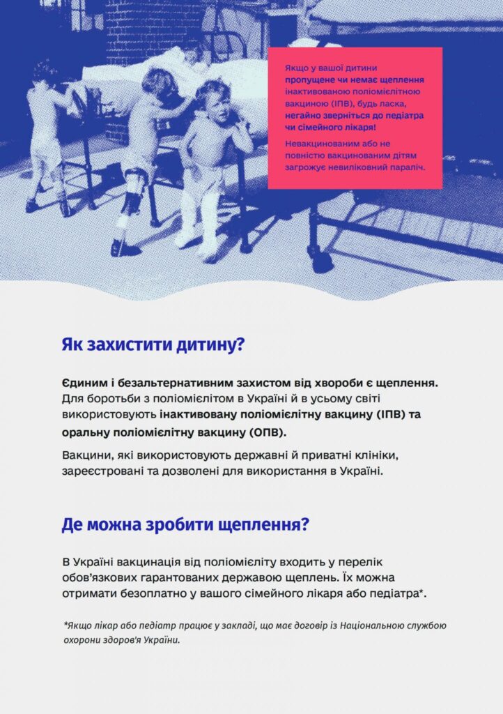 Захистіть дитину від невиліковного паралічу, спричиненого поліомієлітом. Тра 25, 2023 | Новини Захистіть дитину від невиліковного паралічу, спричиненого поліомієлітом. Ліків від цієї хвороби не існує, єдиним і безальтернативним захистом від хвороби є щеплення.