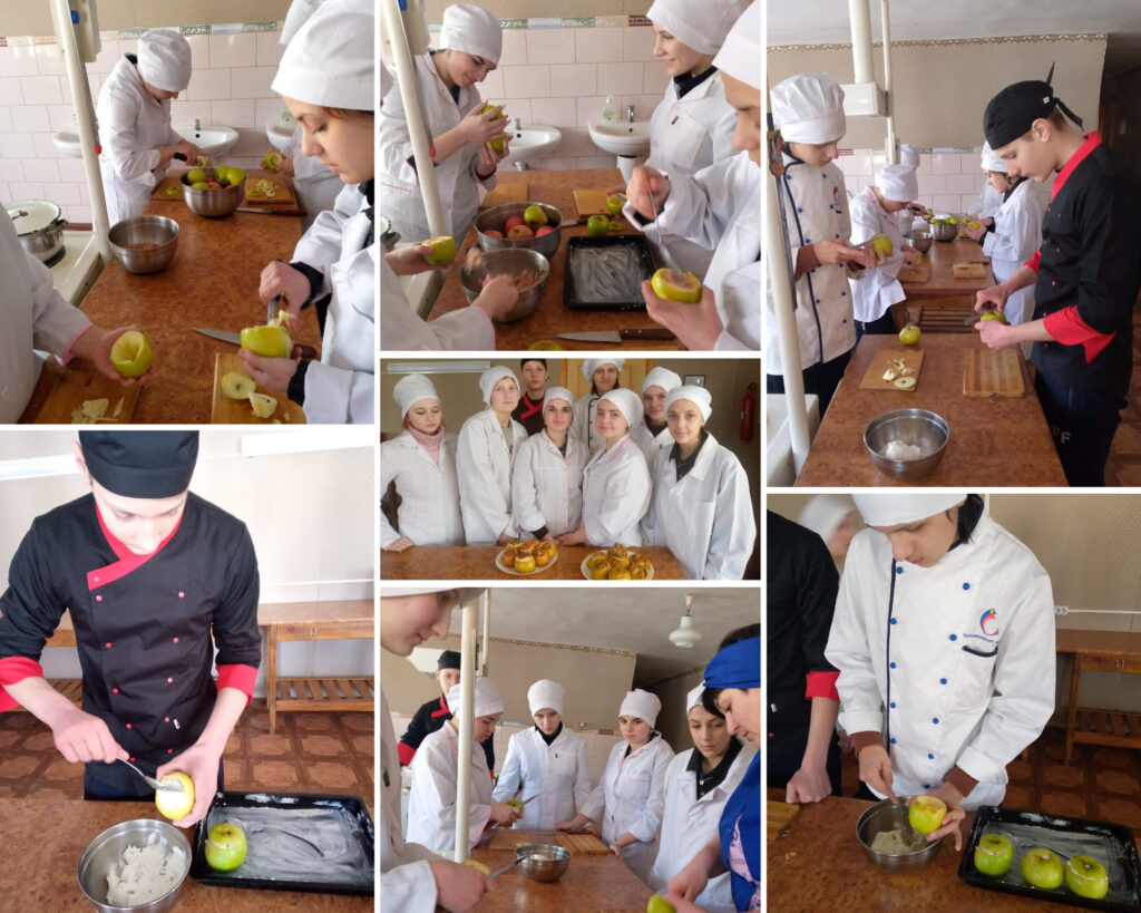 В групі I курсу 35-к проводиться заняття виробничого навчання за професією “Кухар; Кондитер”, під час якого здобувачі освіти відпрацьовують практичні навички з теми “Приготування страв з фаршированих та запечених овочів та фруктів.” Яблука запечені в духовій шафі”